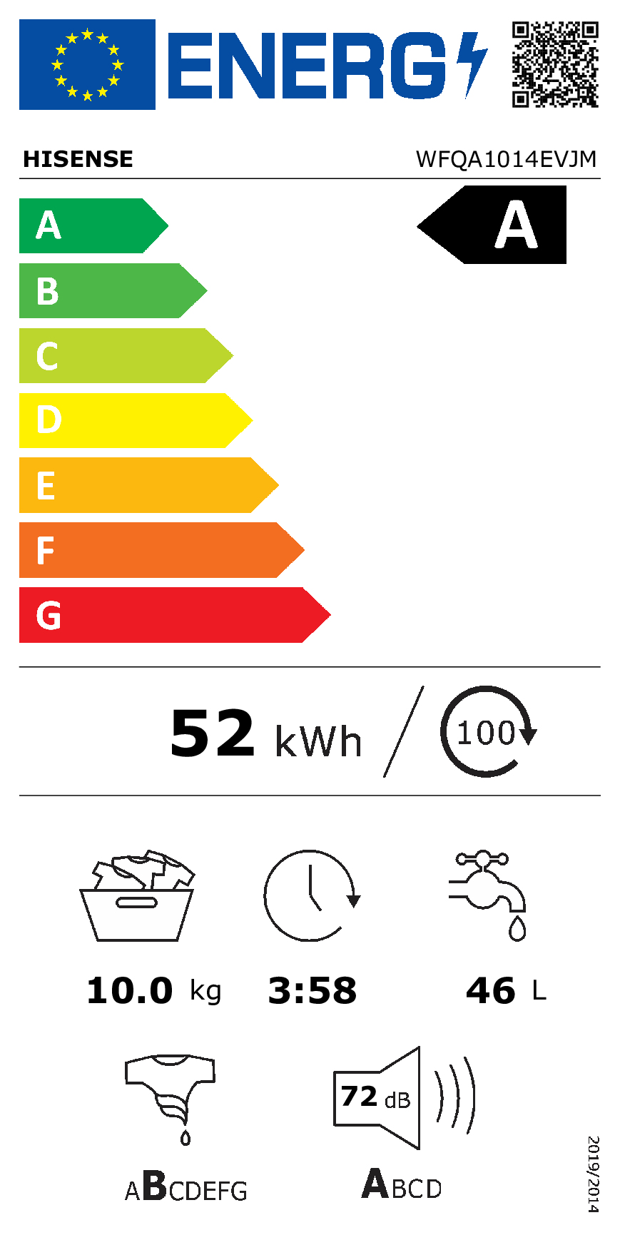 - Tecnologie Hisense (cura dei vestiti): Allergy Care, Big LED Display, Blocco bambini, Pulizia tamburo, Durable Inverter, Favourite, Pause & Add, Pure Steam, PureJet, Lavaggio rapido, Self-Diagnostic